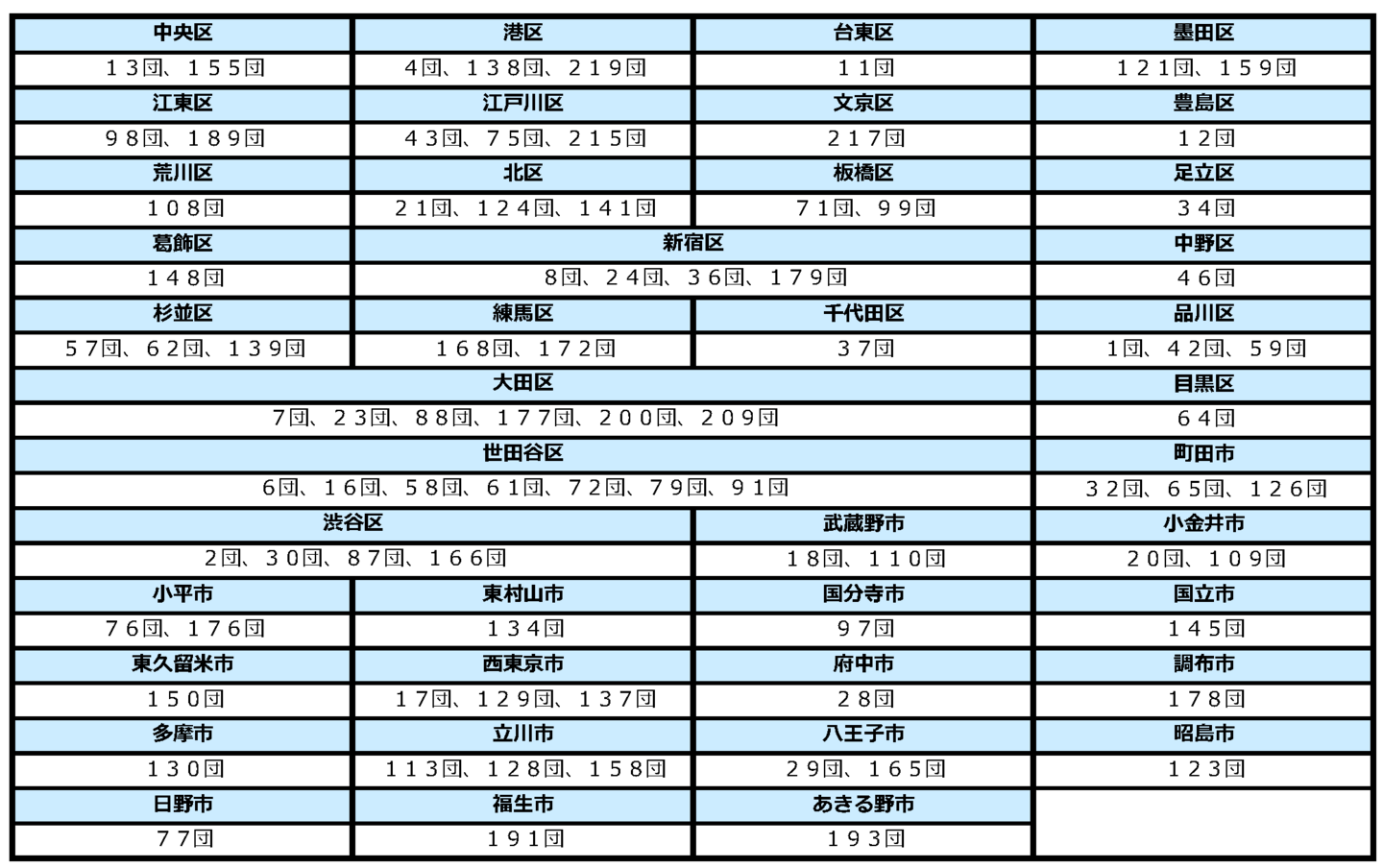 Webサイト・SNSに活動の様子を掲載している団の情報も、ぜひご覧くださいね。お問合せは、各団のWebサイト・SNSから直接のご連絡もお気軽にどうぞ!!もし、ご希望の団の問い合わせ先がわからない場合は、お問合せフォームへ必要情報をご入力のうえ、ご希望の団番号をお知らせください。該当団より、改めてご連絡いたします。